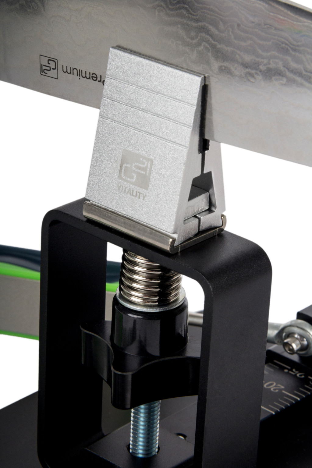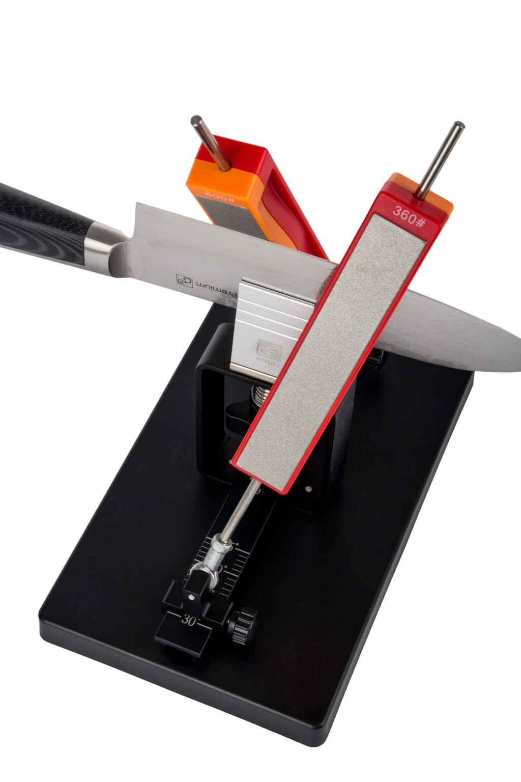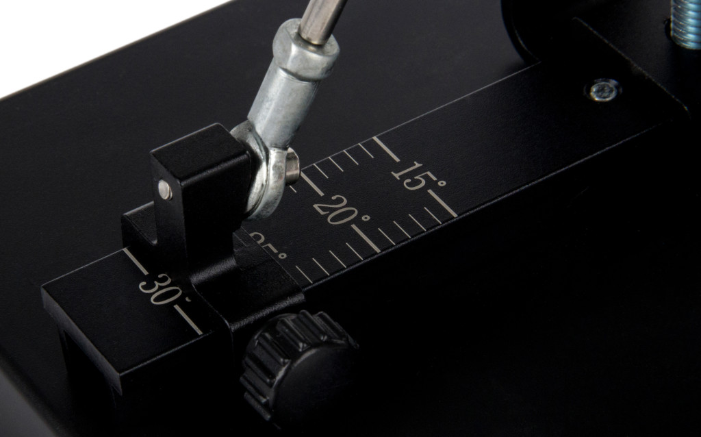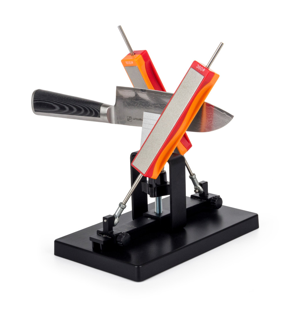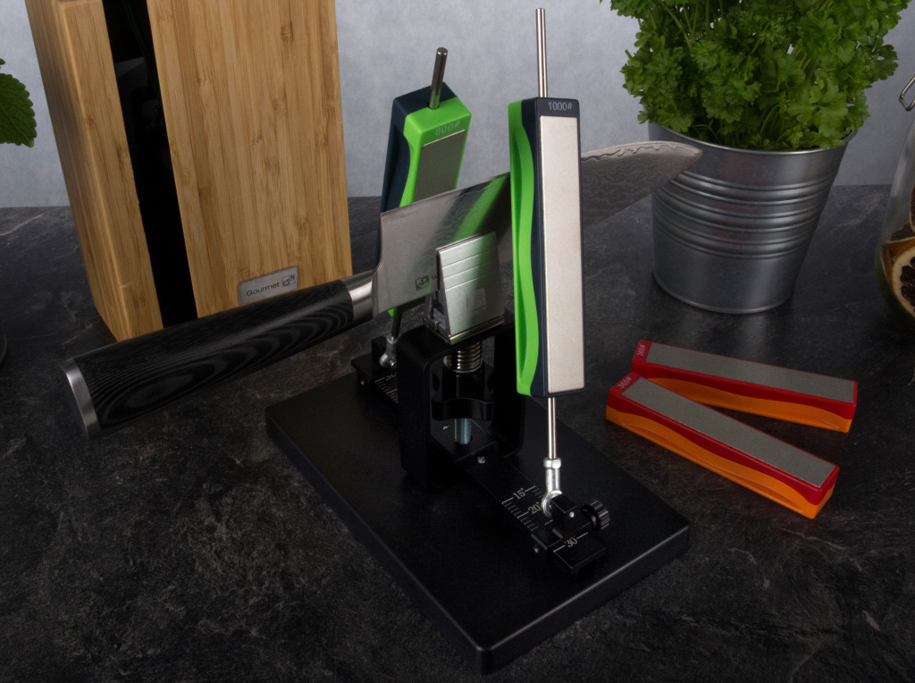 Az élezési élszög a sínek segítségével egyszerűen, és fokozatmentesen beállítható, oldalanként 15 és 30 fok között. Damaszt késeknél 20-25°-ra, normál késeknél 25-30°-ra állítsa a szöget.
