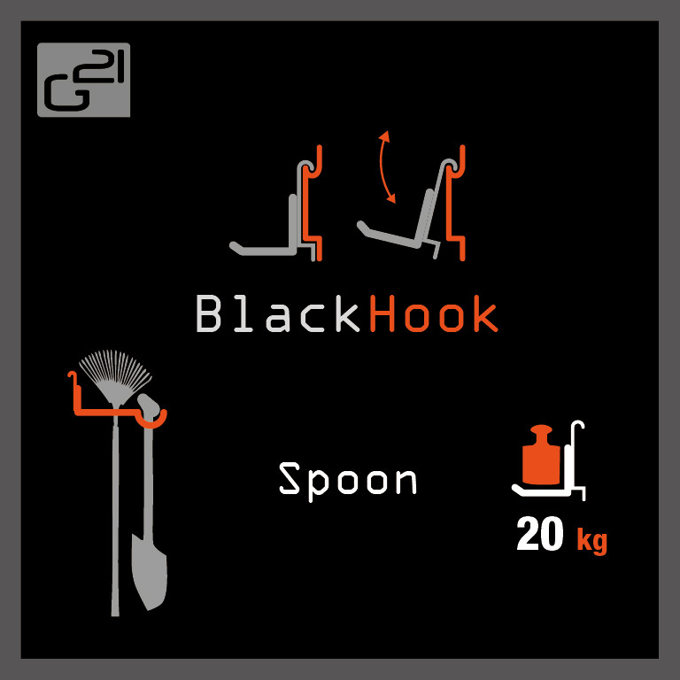A G21 BlackHook spoon univerzális tartó lehetővé teszi a sport felszerelés, kerti szerszámok és egyéb kellékek, pl. lapátok és seprűk felakasztását. Segít rendet tartani a műhelyben vagy a garázsban, ugyanakkor minden mindig kéznél lesz.