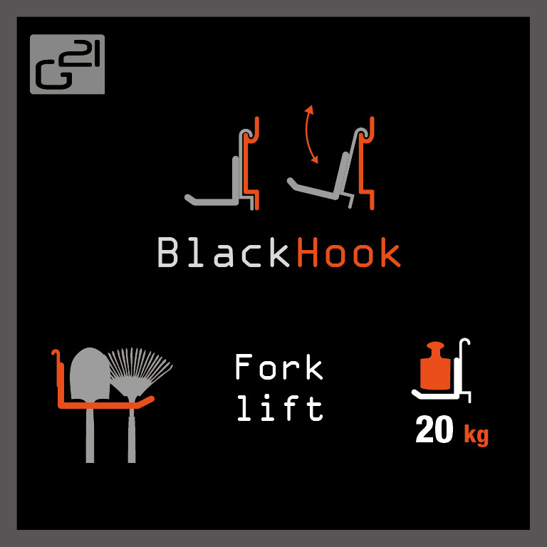 A G21 BlackHook fork lift univerzális tartó lehetővé teszi a sport felszerelés, kerti szerszámok és egyéb kellékek, pl. seprűk vagy kapák felakasztását. Segít rendet tartani a műhelyben vagy a garázsban, ugyanakkor minden mindig kéznél lesz.