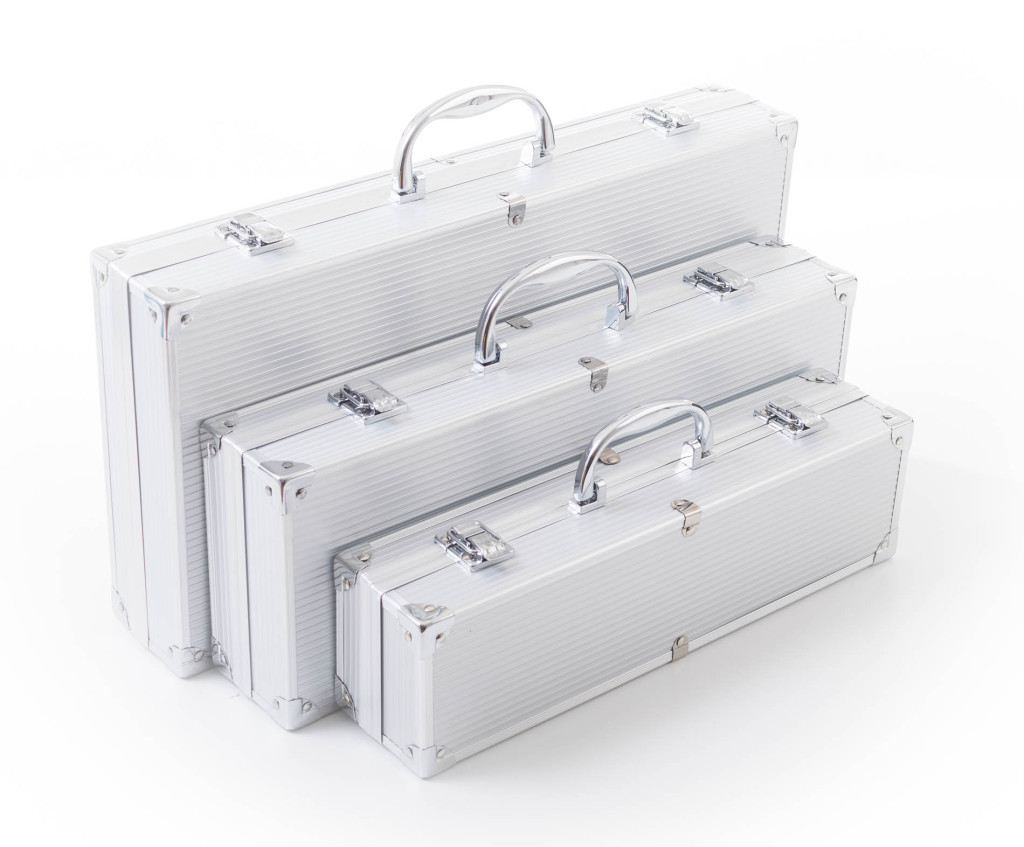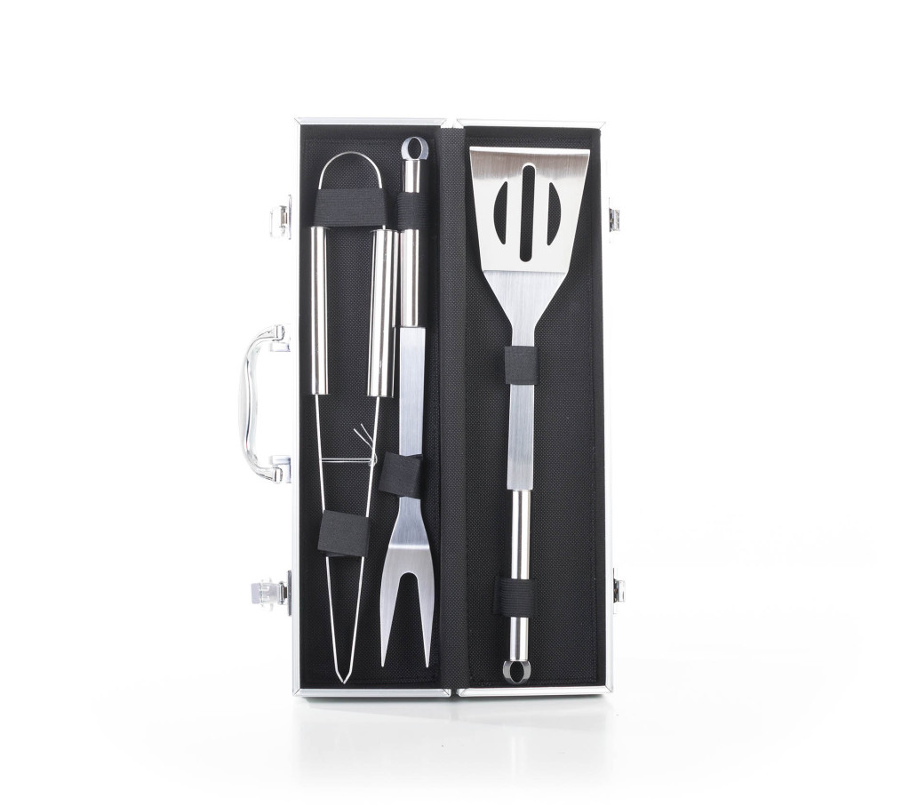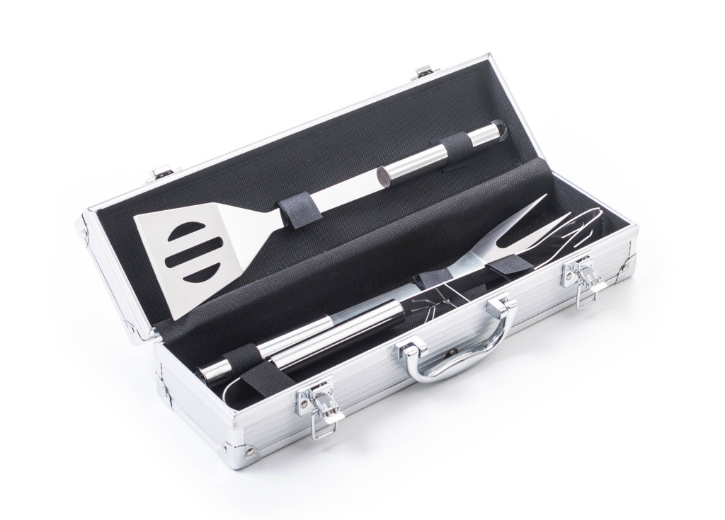 A készlet tartalmaz minden eszközt a gond nélküli grillezéshez. A készlet része egy 34 cm hosszú húsforgató, villa és csipesz. Az egyszerű áthelyezés és tárolás érdekében az eszközök egy praktikus alumínium bőröndbe vannak elhelyezve.