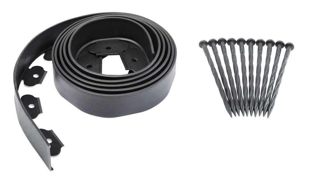 Az alapcsomag mindent tartalmaz. Mind a 3 m hosszú szegély, mind a 10 tüske a láthatatlan szegély biztonságos rögzítéséhez a talajhoz. A szegélyszalag alján lyukak találhatók, amelyekbe a mellékelt szegecseket behelyezi és beveri.