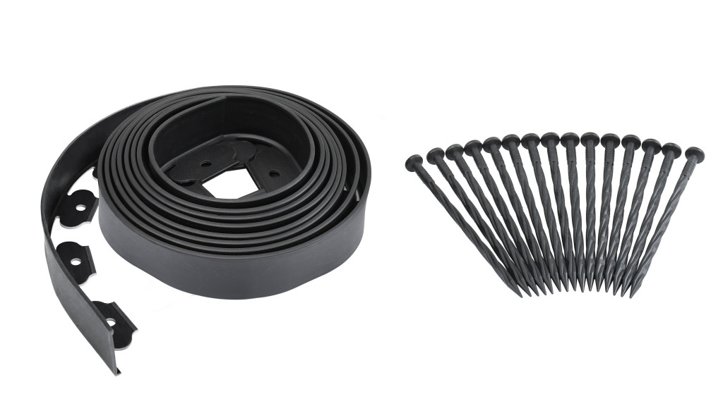 Az alapcsomag mindent tartalmaz. Mind az 5 m hosszú szegély, mind a 15 tüske a láthatatlan szegély biztonságos rögzítéséhez a talajhoz. A szegélyszalag alján lyukak találhatók, amelyekbe a mellékelt szegecseket behelyezi és beveri.