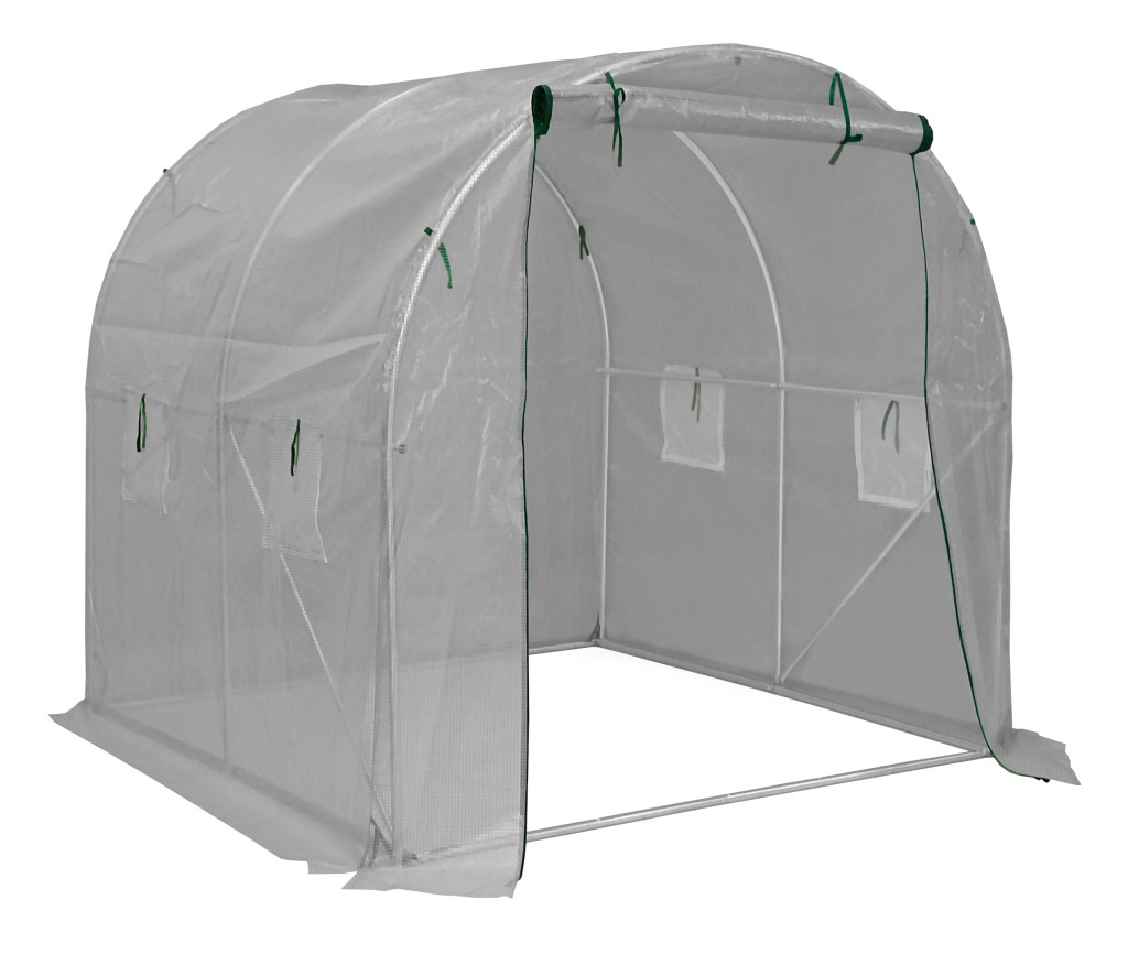 Kerti fóliasátor stabil horganyzott acélszerkezettel, minőségi erősített polietilén (PE) fóliával, elülső fal 120 cm széles bejárati nyílással, 4 szellőzőablakkal, 4 rögzítő kötéllel és csapokkal, cipzáras felgöngyölíthető bejárattal.