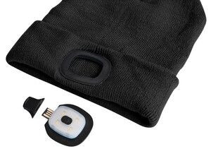Sapka LED fejlámpával, beépített LED lámpa 180 lm (4x45 lm) fényerővel, 3 világítási mód - 50%, 75% és 100%, akkumulátor élettartama akár 4 óra, a fejlámpa eltávolítható és a sapka mosható, hátul fényvisszaverő, egyszerű töltés USB-n keresztül, fekete.